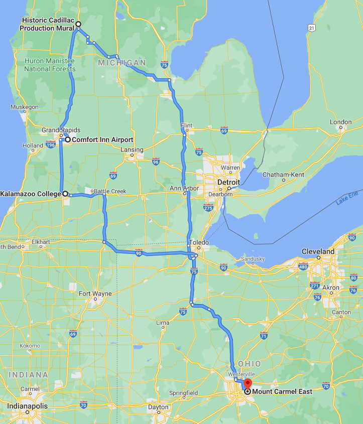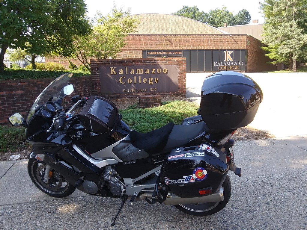 The next morning I loaded up the bike and finished the ride to Kalamazoo. Though the biggest college in the city is Western Michigan University, I chose to use two signs for the smaller Kalamazoo College that I’d scouted on Google Maps’ Street View for photos. With the photos done and both of my ride objectives completed, I got back in the saddle and started the ride home. Though the fastest way back to Columbus was to head through Fort Wayne, Ind., and Lima, Ohio, I opted for a more expressway-heavy ride home.