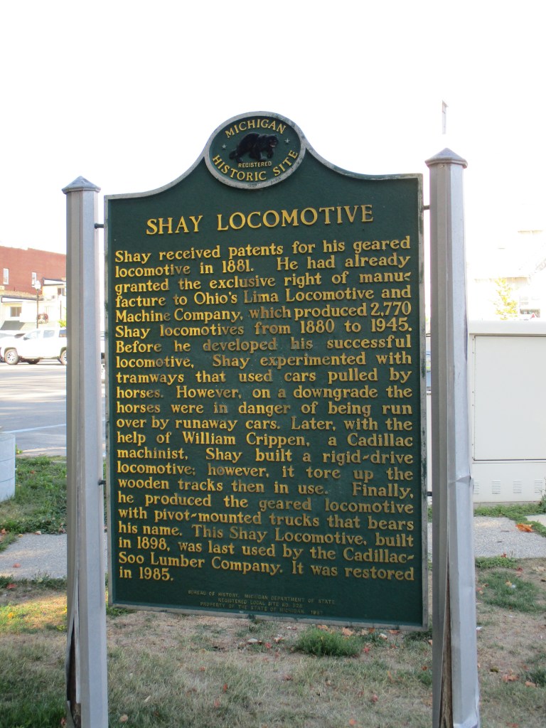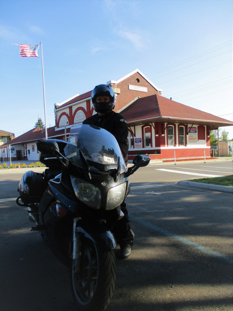 I took the exit for Michigan Route 115 and made a brief hydration stop at a corner store just north of the interchange. When I got back on Route 115 north, it was almost surreal doing 55 mph on a two-lane surface route after the high-speed riding I’d been doing for several hours. An about 40-mile ride (including a lengthy detour for a closed portion of Route 115), landed me in downtown Cadillac. The decorative streetlight-lined boulevard that leads from the U.S. Route 131 expressway to downtown makes for a commanding impression as one rides toward downtown, and I was instantly taken by the stunning shoreline of Lake Cadillac that adorns the western side of downtown. I made brief stops for photos at the public library, a public parking lot along the shore, a former train station and a large mural that details Cadillac’s industrial heritage.
