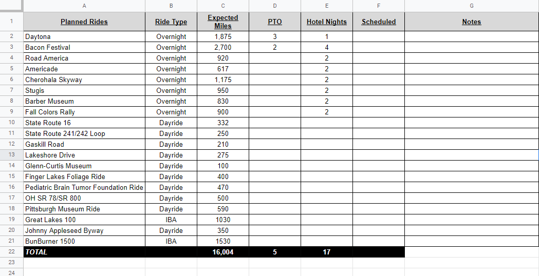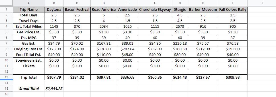 When I have the costs of each ride in the spreadsheet, I compare that to what I’ve allocated in my overall annual budget for motorcycling. Often I have to scale back a few rides to get the numbers to work, but I’d rather be disappointed in January than get to August and not have the funds to go on a tour I’d been looking forward to.
