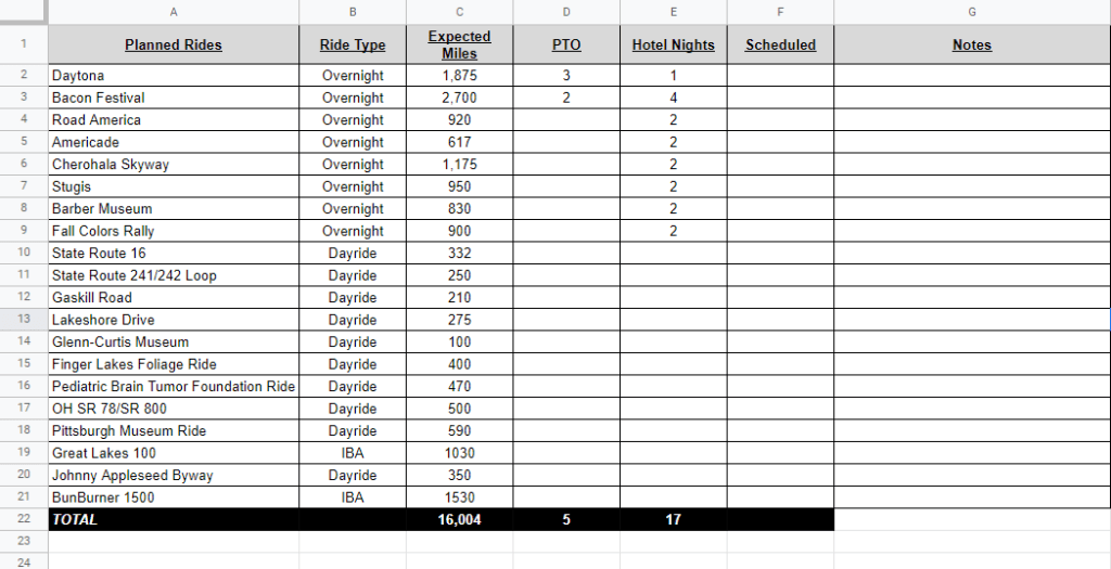 Next, I note which weekend days I know I won’t be free to ride due to holiday get-togethers, family commitments, my side hustle or other commitments. I make sure to talk to my girlfriend to find out what weekends she’ll be out of town (which means I’m home with the dog). I also note days that I may be able to ride part of the day and designate those days for local rides – which I call “dayrides.”