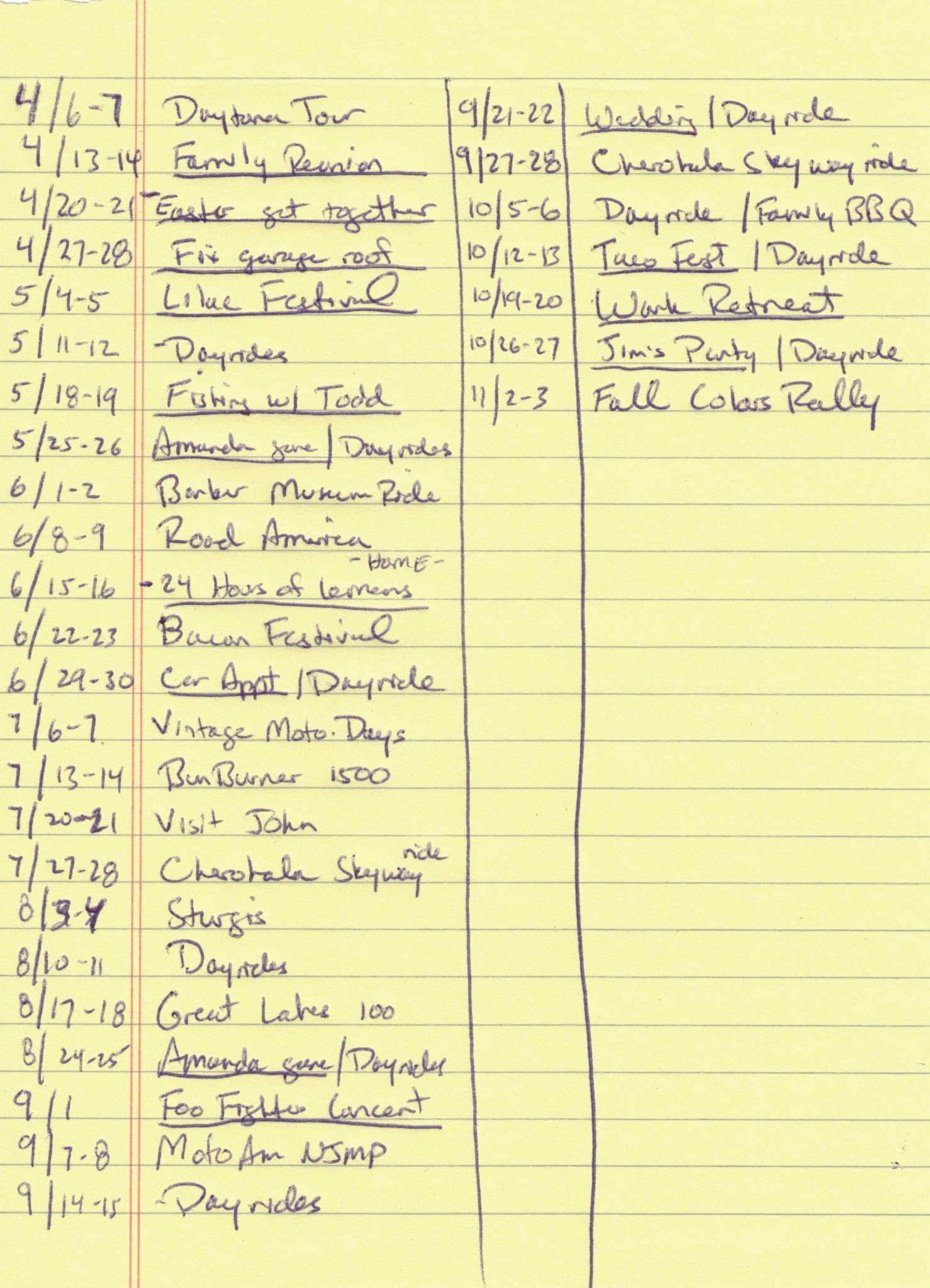 Once I’ve figured out how much time I’ll have to ride, I start going through my lists of planned rides and fill in lines on the legal pad. I usually don’t schedule specific dayrides, but I do pick out specific weekends for any overnight rides. This is especially true for tours that I need to take time off work for. I try to get my list of PTO requests to my employer no later than the beginning of January.