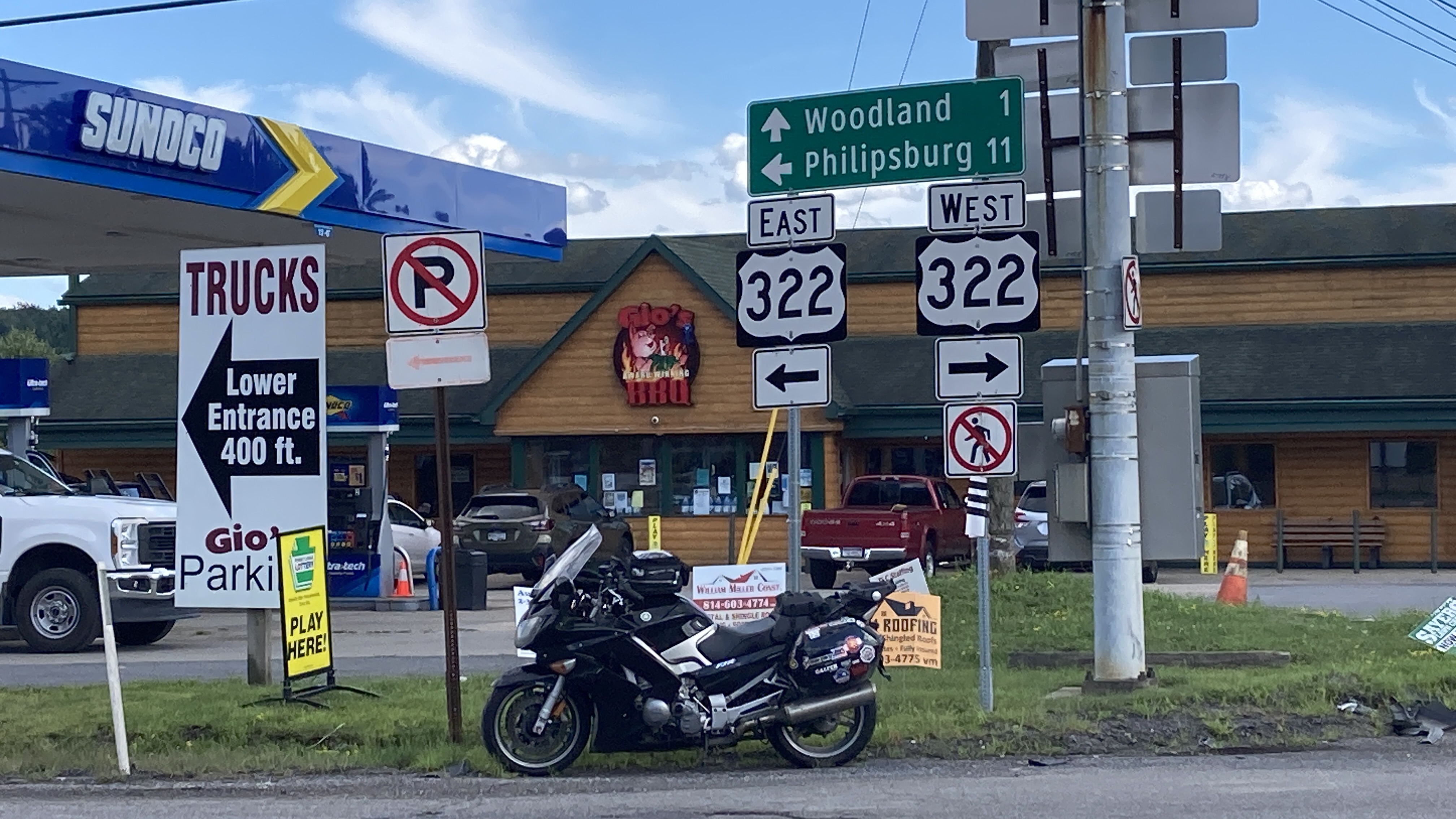 I didn’t make my first stop at Gio’s until 2022, but I first learned about the place when I was living near Allentown, Pa., in 2013-2014. The toll-free route from Allentown to central Ohio (where Mid-Ohio Sports Car Course is located) is Pennsylvania State Route 33 to Interstate 80, and those trips took me past I-80’s Exit 123 for Woodland, Pa. Gio’s had their logo on one of the blue-background “This Exit” signs on I-80. My recollection of the former sign – with its brown and green color scheme – for some reason made me think it was a Mexican restaurant. I was very surprised to learn it was a BBQ joint when I researched it online in 2022. I always wanted to stop and check it out, but each time I rode through I was short on time and chose to not stop.